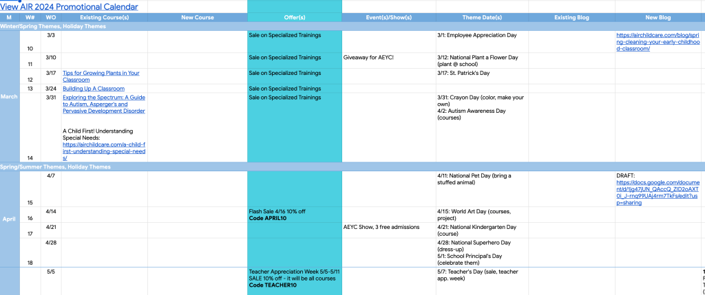Created a strategy doc to present to the client, added tabs for various goals including email marketing, social media marketing, and promotions calendar.